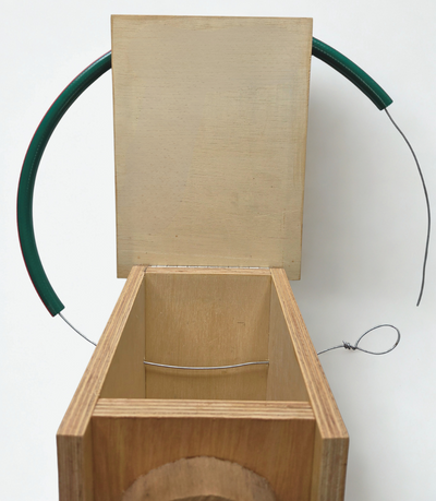 Before installing: You may need to cut down the wire or hose depending on the diameter of the tree you choose but ensure enough slack for tree growth. Feed the supplied wire through both the pre-drilled holes in the back of the box. Create a loop at one end of the wire, twisting to secure.